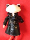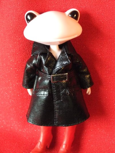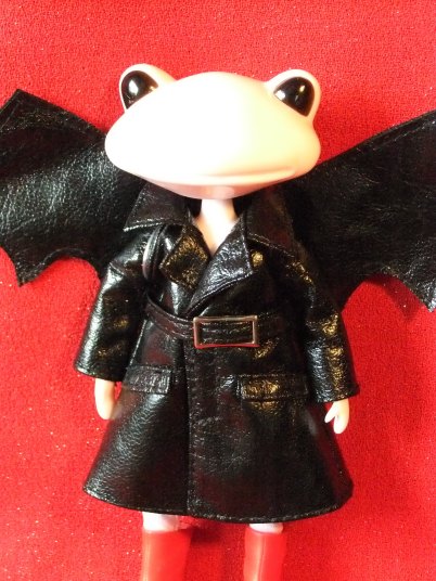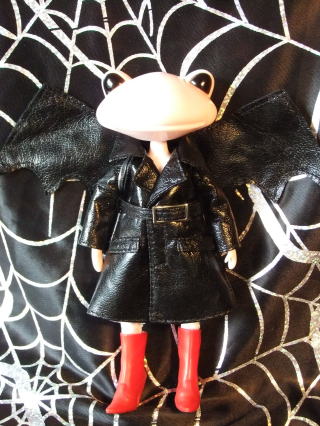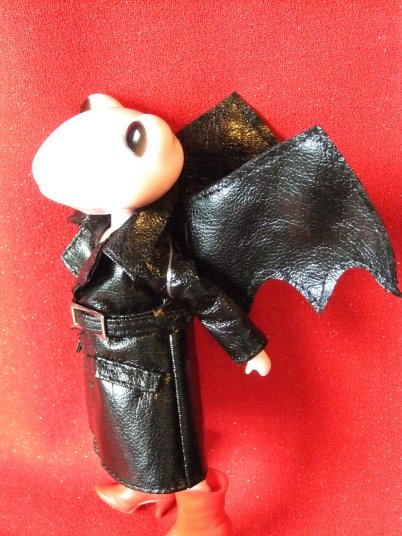 光沢のある合皮の生地で、コウモリをイメージしたコートを作りました。